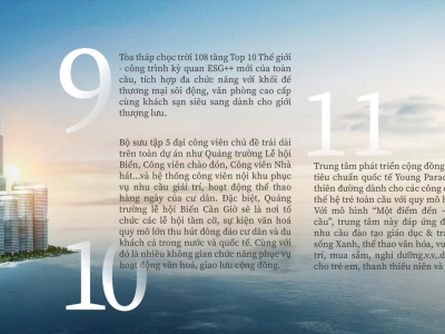 Blue Waves Theatre – 7ha – Nhà hát lớn nhất Đông Nam Á, 5.000 chỗ ngồi, thiết kế Gensler Paradise Lagoon – 443ha – Biển hồ nước mặn lớn nhất thế giới, tắm biển 365 ngày Sân Golf – 2 sân 18 lỗ – West Sunset (Tiger Woods), East Sunrise (Robert Trent Jones Jr.) Tòa tháp 108 tầng – Top 10 thế giới – Khách sạn + Văn phòng + Thương mại Khu giải trí – 122ha – VinWonders, Safari, Winter Wonderland 30.000m² Landmark Harbour – Cảng 5 sao đón siêu du thuyền và tàu du lịch thế giới Y tế – Vinmec + Cleveland Clinic (hệ thống y tế #1 Mỹ) Giáo dục – Vinschool 97 trường + Young Paradise Hub 4.6ha Thương mại – Vincom Mega Mall + 82 dãy shophouse Khách sạn – ~7.000 phòng, 20+ thương hiệu quốc tế Giao thông xanh – VinBus xe buýt điện, Metro tốc độ cao 250km/h Năng lượng xanh – Hệ thống điện gió ngoài khơi cách bờ 10km |