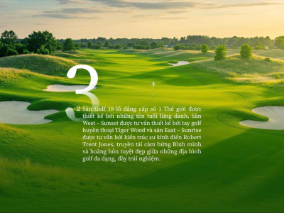 2 Sân Golf 18 lỗ đẳng cấp số 1 Thế giới được thiết kế bởi những tên tuổi lừng danh. Sân West – Sunset được tư vấn thiết kế bởi tay golf huyền thoại Tiger Wood và sân East – Sunrise được tư vấn bởi kiến trúc sư kinh điển Robert Trent Jones, truyền tải cảm hứng Bình minh và hoàng hôn tuyệt đẹp giữa những địa hình golf đa dạng, đầy trải nghiệm.